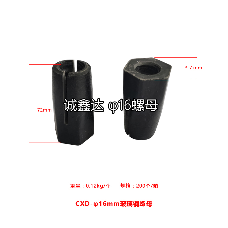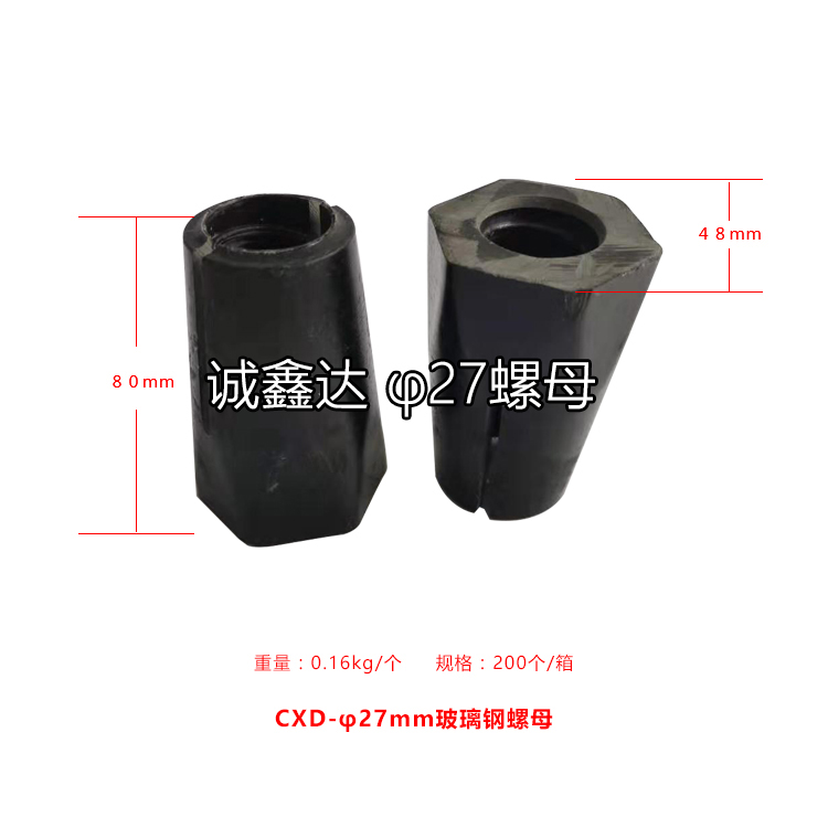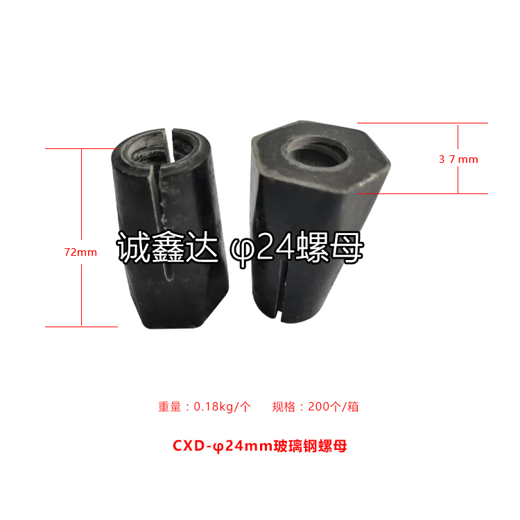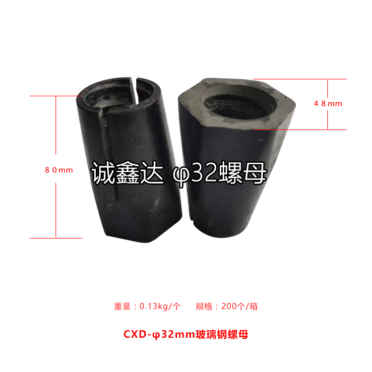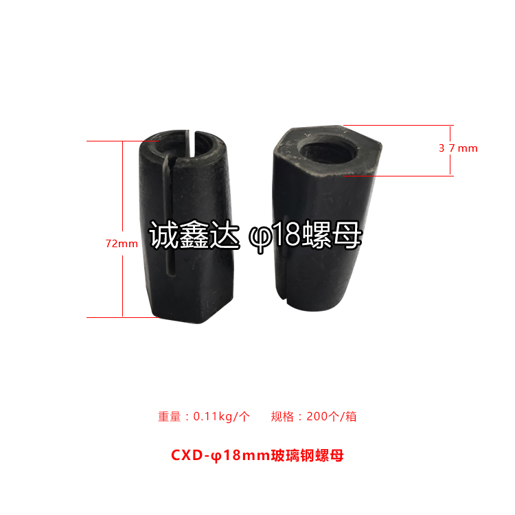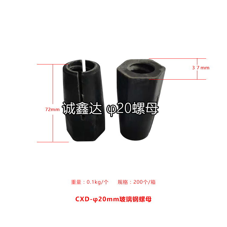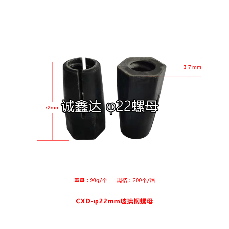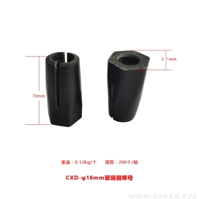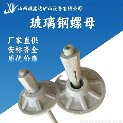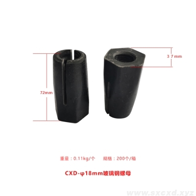 作為礦山支護配件,山西誠鑫達研發(fā)了一種高抗拉強度的玻璃鋼螺母,螺母本體開有內(nèi)螺紋孔,在內(nèi)螺紋孔孔壁設(shè)螺紋,螺母本體的前部分外形為錐形且用于與托盤緊密配合,在螺母本體的前部分的錐形面開設(shè)有通槽,螺紋孔的前部呈喇叭形,這樣螺紋孔的前端直徑大于后端的直徑,進入托盤錐形孔后,螺母本體的前端和中部同時收縮,使螺母本體的內(nèi)螺紋與錨桿外螺紋緊密配合,拉緊長度增加到25mm—30mm,擴散了應(yīng)力,使抗拉強度明顯提高。